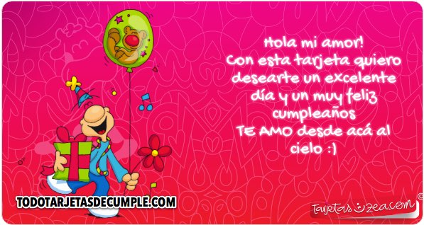 La tarjeta tiene una frase muy linda que dice hola mi amor, cno esta imagen quiero desearte un excelente día y un muy feliz cumpleaños. Además de eso también dice te amo.