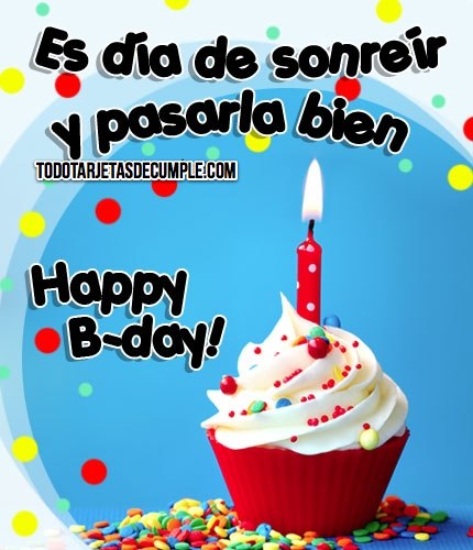 El último modelo de tarjetas de cumpleaños que queremos dejarles, y como pueden ver, su diseño es muy lindo con un fondo de color celeste y un cupcake decorado con una vela. Además de eso también tiene una frase que dice lo siguiente: "Es día de sonreír y pasarla bien. Happy bierthday!".