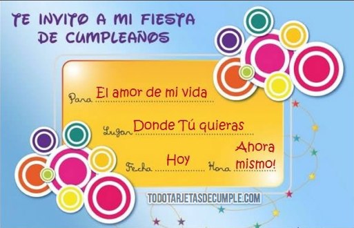 En esta ocasión les queremos dejar un nuevo diseño de tarjetas de cumpleaños que es muy divertido ya que se ha utilizado una tarjeta de invitación de cumpleaños, pero rellenada con un lindo mensaje para nuestra pareja, la cual dice: Para el amor de mi vida, lugar donde tú quieras, fecha hoy, hora ahora mismo. Esperamos que les haya gustado y que la bajen para regalársela a la persona que aman.