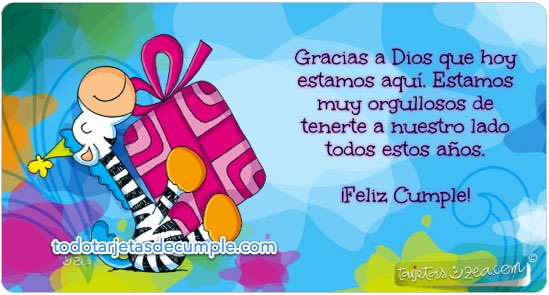 Seguimos agregando nuevos modelos de tarjetas de cumpleaños a nuestra colección, y en este caso se trata de una hermosa tarjeta muy colorida que tiene una cebra con un regalo y una frase que dice lo siguiente: "Gracias a Dios que hoy estamos aquí. Estamos muy orgullosos de tenerte a nuestro lado todos estos años ¡Feliz cumple!"
