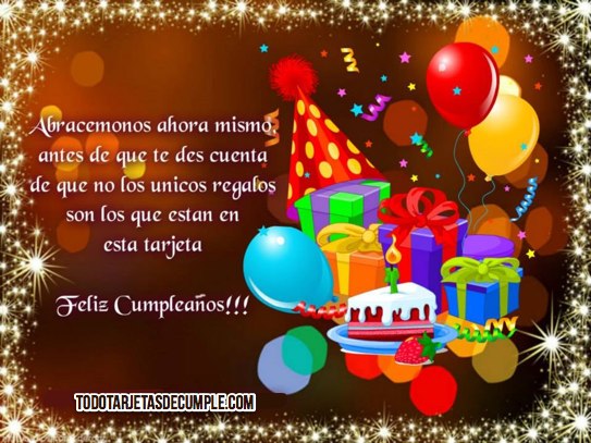 Miren qué divertido modelo de tarjetas de cumpleaños que les queremos dejar en esta oportunidad. Como pueden ver, en la tarjeta hay regalos, globos, gorros, pasteles, y una frase simpática que dice lo siguiente: "Abracémonos ahora mismo, antes de que te des cuenta de que los únicos regalos son los que están en esta tarjeta. Feliz cumpleaños!".