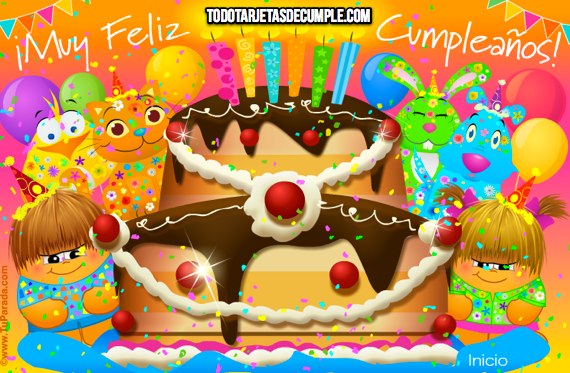 Tarjetas de cumpleaños con torta gigante, globos y animalitos