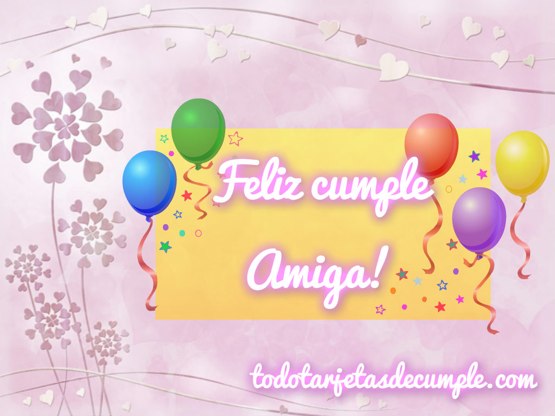 Seguimos sumando más modelos de postales y tarjetas de cumpleaños gratis, y en este caso les vamos a dejar un nuevo diseño de imágenes de feliz cumple amiga, con la cual podrán felicitar a sus amigas por su cumpleaños y darles una linda sorpresa. Como pueden ver más abajo, es una hermosa tarjeta de cumpleaños que tiene un fondo en color rosa con corazones y un marco amarillo con globos que dice "Feliz cumple amiga!". Esperamos que les haya gustado esta imagen y las invitamos a que la descarguen para enviársela a sus amigas.