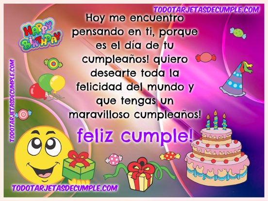 Quizás un día te encuentres con que cumple años una persona muy querida por ti y no tengas palabras para decirle, no porque no sientas nada ante la llegada de su cumpleaños, sino porque simplemente no te sale nada!. No te preocupes, para estas ocasiones es que realizamos tarjetas de cumple con dedicatorias para descargar gratis, tenemos muchas frases distintas entre las cuales elegir la que más te guste y quisieras decirle al homenajeado. Para el día de hoy sumamos una nueva felicitación o dedicatoria de cumple muy bella, donde dice que estás pensando en el cumpleañero, y que quieres desear mucha felicidad en su día, como paso final termina con la frase que tengas un maravilloso cumple. Para usar estas u otras tarjetas del sitio, busca la que más te guste, y descárgala como cualquier imagen a la PC, una vez realizados estos pasos contarás con la imagen para compartir en redes sociales de tu preferencia.